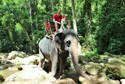 Der Ort, in dem unser Hotel ist, heißt Chaweng. Es scheint der belebteste Ort der Insel zu sein: Viele Restaurants, die sowohl westliche als auch asiatische Gerichte anbieten, viele Bars, Geschäfte, usw. Hier ist es vor allem gegen Abend belebter, ab morgens aalen sich die meisten hier am Hotelpool oder Strand in der Sonne und sind auf ihre Bräune bedacht. Da können wir leider nicht so mitreden, wir waren meistens unterwegs: Sei es am Strand entlang Richtung Norden oder Süden, oder mit einen hoteleigenen Kajak auf dem stillen Wasser. Ein Highlight hier auf Koh Samui war auf jedenfall der Namuang Wasserfall! Dort war es wirklich total schön und idyllisch. Zudem sind wir hier auch wieder auf einem Elefanten geritten! Dieses Mal durften wir sogar direkt auf ihm sitzen, das war toll! Außerdem durften wir auf einer Kokosnussfarm bestaunen, wie Affen auf die Palmen klettern und die Kokosnüsse pflücken! Das Ganze hatte zwar eher den Charakter einer Show, aber scheinbar werden alle Kokosnüsse auf Koh Samui derart gepflückt und Koh Samui sei sogar der Hauptlieferant Thailands was Kokosnüsse betrifft.