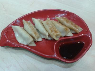 Gebratene Jiaozi mit Essig (Jiaozi mit Essig sind nicht ganz meins, aber mit Soja-Sauce, die meistens auch direkt am Tisch steht, kann ich nicht widerstehen!)