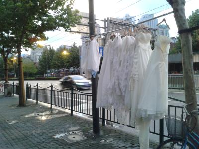Immer wieder gibt es aber auch diese Momente, in denen ich hundert Meter weiter gehe und mich frage: „Habe ich das gerade wirklich gesehen und bin einfach so daran vorbei gegangen?“ Würden sich die gleichen Situationen in Deutschland abspielen, wären das wohl größere Attraktionen! Wie z.B. ein Mann, der mit seinem Pudel Hand in Hand durch Shanghai schlenderte oder folgende Brautkleider, die einfach so auf dem Gehweg einer vielbefahrenen Straße hingen: