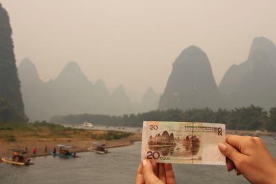 Am nächsten Tag haben wir eine Boot-Fahrt auf dem Fluss Li (漓江 Lijiang) unternommen. Die Fahrt von Guilin nach Yangshuo dauert etwa 4,5 Stunden und führt durch die schöne Berglandschaft. Der Li und seine Landschaft sind in China vor allem durch den 20-Yuan-Schein berühmt, da auf seiner Rückseite ein Bild davon zu sehen ist. Als wir nach etwa drei Stunden Fahrt endlich an der Stelle angekommen waren, waren wir fast die einzigen, die an Deck standen und den Schein mit der Landschaft verglichen haben. Grund: Es gab zeitgleich ein Buffet und das schien in dem Moment für die anderen Menschen an Bord wichtiger zu sein. Hinterher haben wir dann auch bemerkt wieso! Chinesen gehen mit mehreren Tellern gleichzeitig zum Buffet, manche auch direkt mit Tablett. Das Buffet war so gut wie leer gefegt als wir als einer der Letzten an der Reihe waren! Naja, dafür haben wir die wichtigste Stelle der Fahrt gesehen!