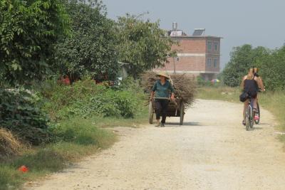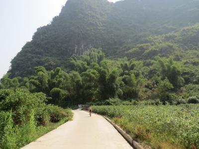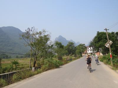 Am darauffolgenden Tag haben wir uns Mountainbikes vom Hotel ausgeliehen und sind die empfohlene Route durch ein paar kleine Dörfer bis hin zur Drachenbrücke (遇龙桥 Yulongqiao) gefahren. Der Weg war wieder super schön. Von der 600 Jahre alten, steinernen Bogenbrücke haben wir uns daraufhin mit einem Bambusboot ein Stückchen Richtung Hotel fahren lassen. Der Fluss besitzt im Prinzip keine Bewegung und er darf nicht mit Motorbooten befahren werden. Daher ist die Wasseroberfläche so glatt, dass sich die Landschaft darin spiegelt. Herrlich! :) Die Stelle, an der uns die Lenker der Boote herausgelassen haben, war jedoch etwas merkwürdig: Mitten in dem Garten/ Feld eines Bauernhauses. Es ging etwa einen Kilometer über einen unglaublich schmalen „Weg“ bis zur nächsten Straße. Gezeichnet von den Büschen und sämtlichen anderen stacheligen und nicht-stacheligen Pflanzen waren wir froh wieder befestigten Boden unter den Füßen bzw. Rädern zu haben und fuhren zurück zum Hotel.