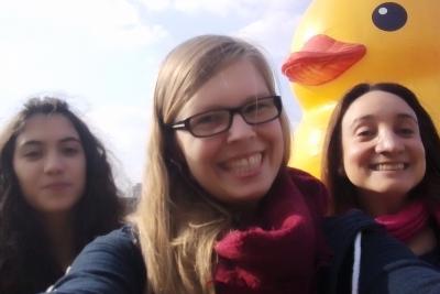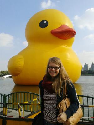 Letzten Donnerstag bin ich zudem mit zwei Kommilitoninnen in den Century Park (世纪公园 shiji gongyuan) gefahren. Der Century Park liegt im Stadtteil Pudong und ist der größte Shanghais. Der Park an sich ist wirklich ganz nett, vor allem um die letzten wärmeren Tage auf einer der Grünflächen am See zu genießen. Wir sind jedoch hauptsächlich wegen der großen gelben Ente gekommen, die bis zum letzten Wochenende hier zu Besuch war. Vor 1-2 Jahren habe ich das erste Mal von der großen gelben Ente des niederländischen Künstlers Florentijn Hofmann gehört und kann mich noch gut daran erinnern, dass ich mich gefragt habe, warum die Menschen denn bitte scharenweise herbeiströmen würden, nur um eine große gelbe Ente zu sehen. Und jetzt bin ich eine von ihnen! Haha! Naja, ihr Ziel ist es Freude um die Welt zu bringen und die ist am Donnerstag auf jeden Fall bei uns angekommen! Es war ein schöner Nachmittag. :-) Gute Reise, Ente, dein Weg um die Welt geht nun weiter!